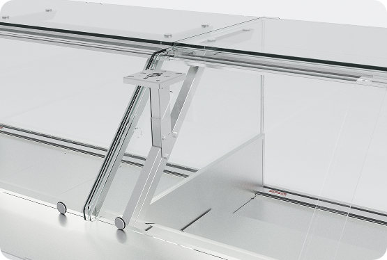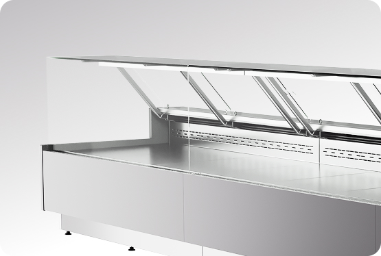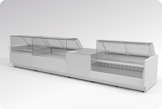 Позволяет выстраивать сложные конфигурации из витрин с разными температурными режимами (от низкотемпературных до тепловых).