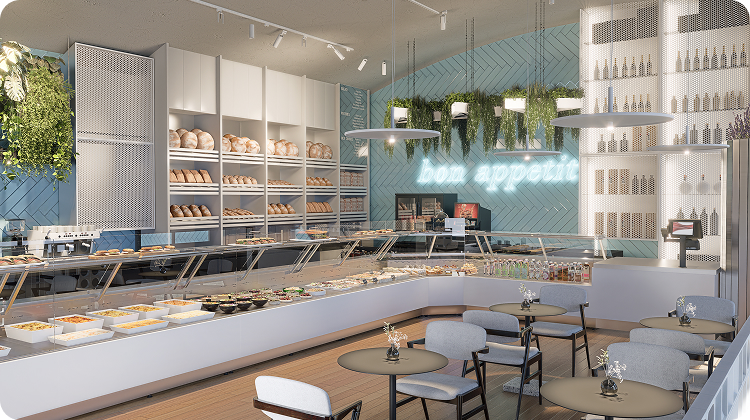 «Воздушный» дизайн витрин акцентирует внимание на продуктах, создавая ощущение свободного доступа для покупателей.